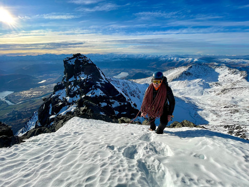 From the helipad the actual climbing began. The temperature decided to turn from very cold to very nice. The sun was out and the sky a blue-ish hue. We traversed slightly below the ridge for awhile and then busted out the rope. The climbing was easy, however, sections of easy scrambling were now covered by small amounts of snow on rock. Henry, being the stronger climber, lead the crux sections.